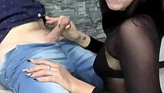 long leather boots lead to explosive footjob cumshot in pants