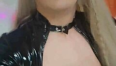 intriguing busty transwoman in crossdressing wanks her big cock solo with handjob