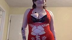 Chubby tattooed babe strips teases and cums on knees shaking ass