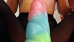 bad dragon toy stretches hairy pussy close-up