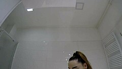 college brunette flashes panties under miniskirt in bathroom